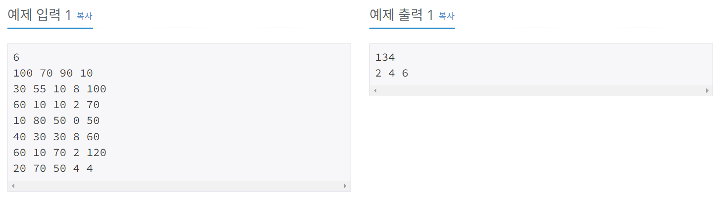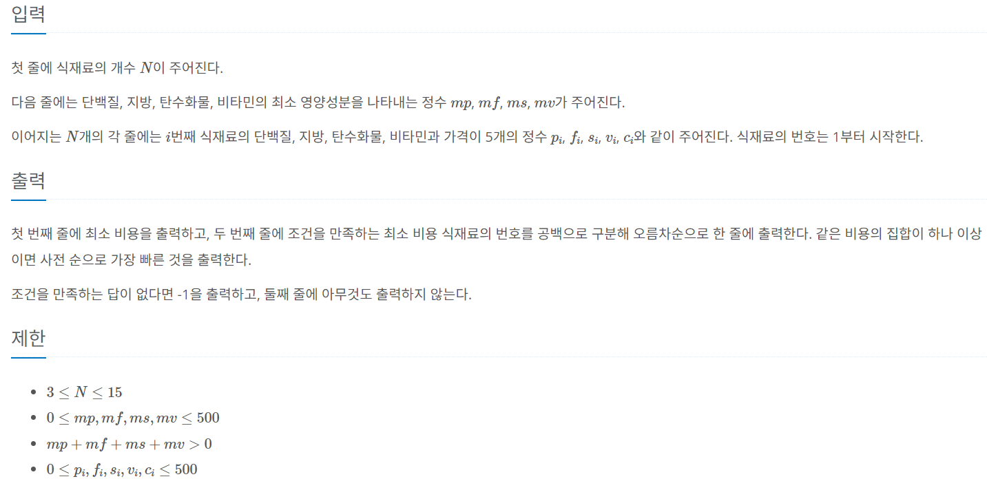 recur(idx+1, a+ingre[idx][0], b+ingre[idx][1], c+ingre[idx][2], d+ingre[idx][3], price+ingre[idx][4], pick+[idx+1])
