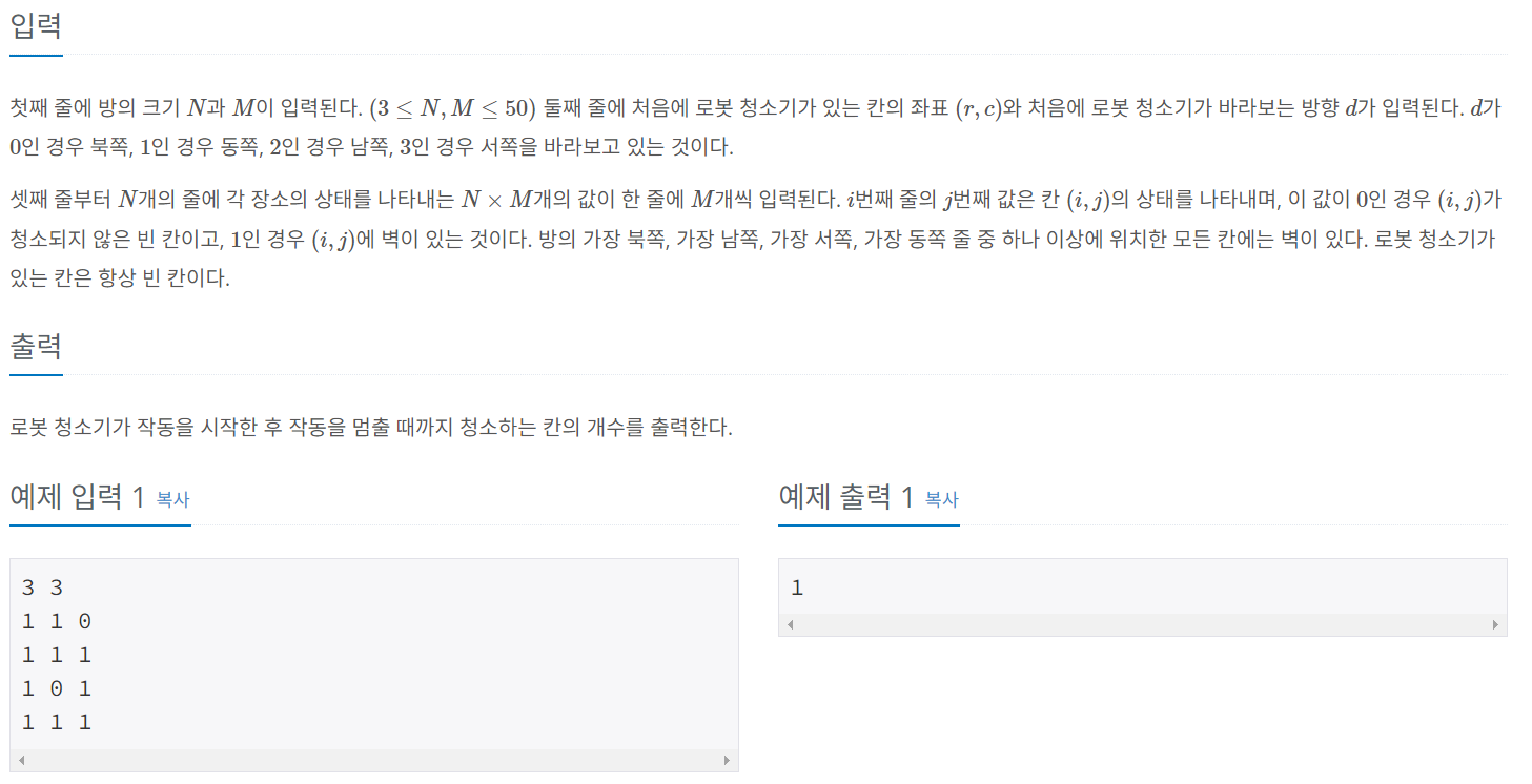 주의할 점은 로봇청소기의 이동 거리를 구하는 것이 아닌 청소 칸의 갯수를 구한다는 점이다.