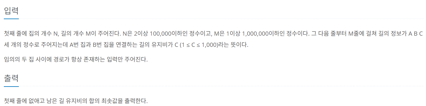 유지비의 합을 최소화하면서 두 마을로 나누기 위해서는 마지막 경로로 이어지는 마을만 따로 분리하면 된다.