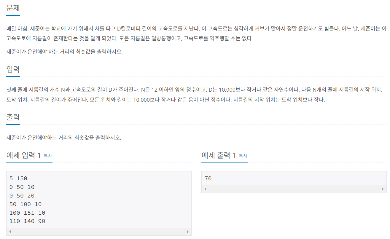 백준 파이썬 1446번 지름길Silver 1https://www.acmicpc.net/problem/1446dp, 다익스트라 두가지 유형으로 풀 수 있는 문제이다.1️⃣ DPimport sysinput = sys.stdin.readlinen, d = map(int, input().split())graph = []dp = [i for i in range(d+1)]for _ in range(n): start, end, dist = map(int, input().split()) #제외 조건 if end > d: continue #고속도로 역주행 불가 if end-start 0: dp[i] = min(dp[i], dp[i-1]+1) #고속도로 for start, end,..